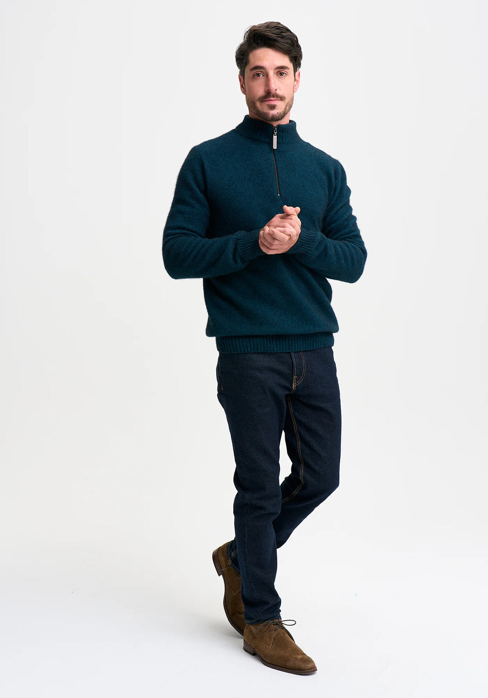 Our signature zip sweater with striped contrast collar features a Merinomink zip pull. This timeless piece can be dressed up or down to suit almost any occasion.