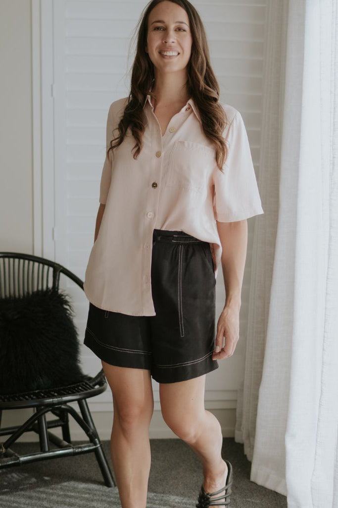 The relaxed fit features a sharp collar and subtle double topstitching for a refined finish. Pale gold Moke buttons add a quiet luxe touch.