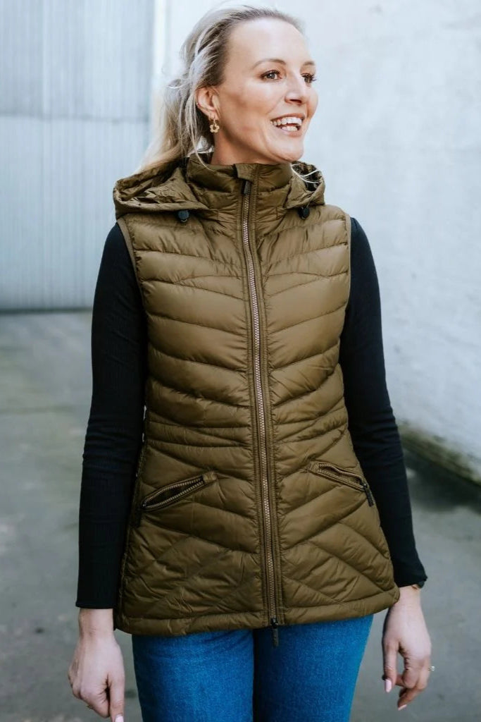 MARY-CLAIRE by MOKE is an ultra-lightweight down vest. Like all MOKE packable down styles, it has a fantastic warmth to weight ratio. This style can been worn on its own or underneath another jacket as an extra insulator for the coldest conditions. MARY-CLAIRE features a detachable hood, tapered waist for extra shape and a flattering high low hem. Its intricate quilt design gives this vest an extra edge. MARY-CLAIRE comes with its own packable bag making it perfect for travel.