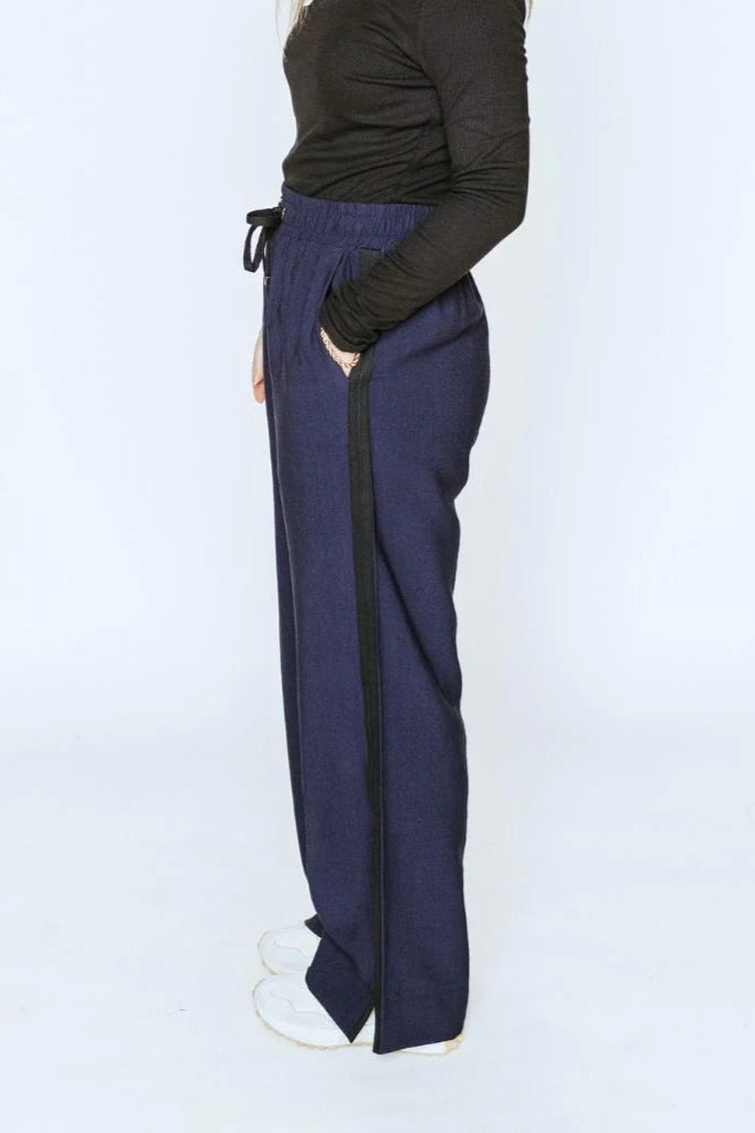 Crafted from a lightweight, breathable viscose-nylon blend, the Indiana Wide-Leg Pants offer a relaxed yet elevated look for any occasion. Designed for versatile wear, they feature sleek black contrast stripes down each leg and side splits at the hem, adding a modern touch to their flowing silhouette.